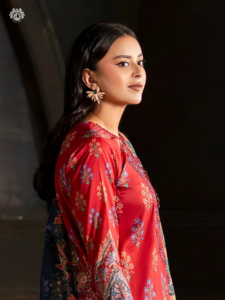 This rich Maroon-Red Embroidered digital printed lawn suit ,features an elegantly embroidered neckline and intricate paisley patterns. The look is perfectly balanced by a deep blue dupatta, creating a classic jewel-toned combination that is both timeless and trendy.