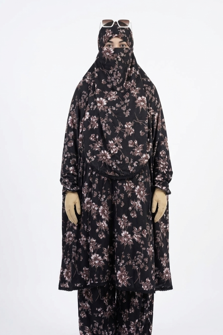 Plaju Khimar Set - Black & Brown Floral Printed Soft Linen