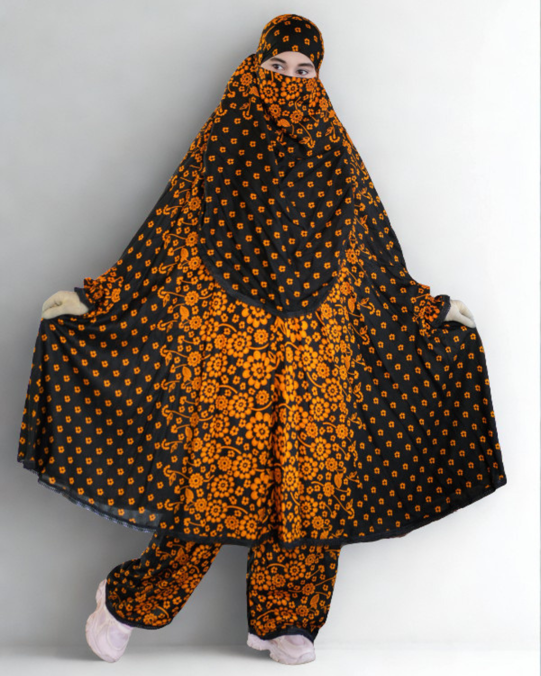 Plaju Khimar Set - Black & Orange Floral Soft Linen