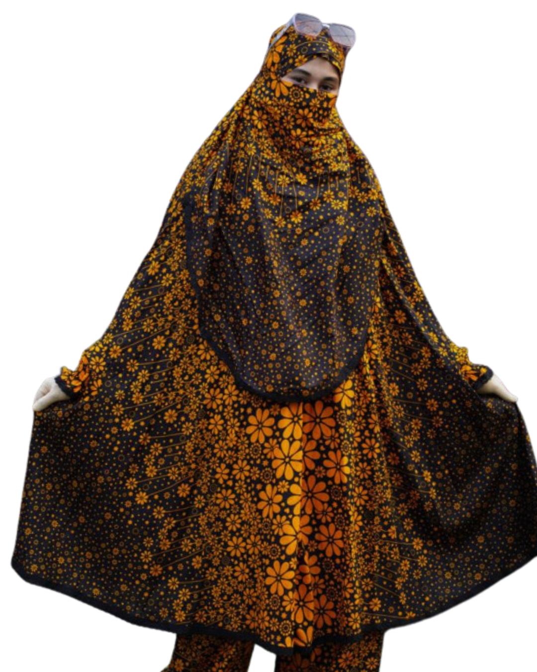 Plaju Khimar Set - Black & Yellow Floral Printed Soft Linen