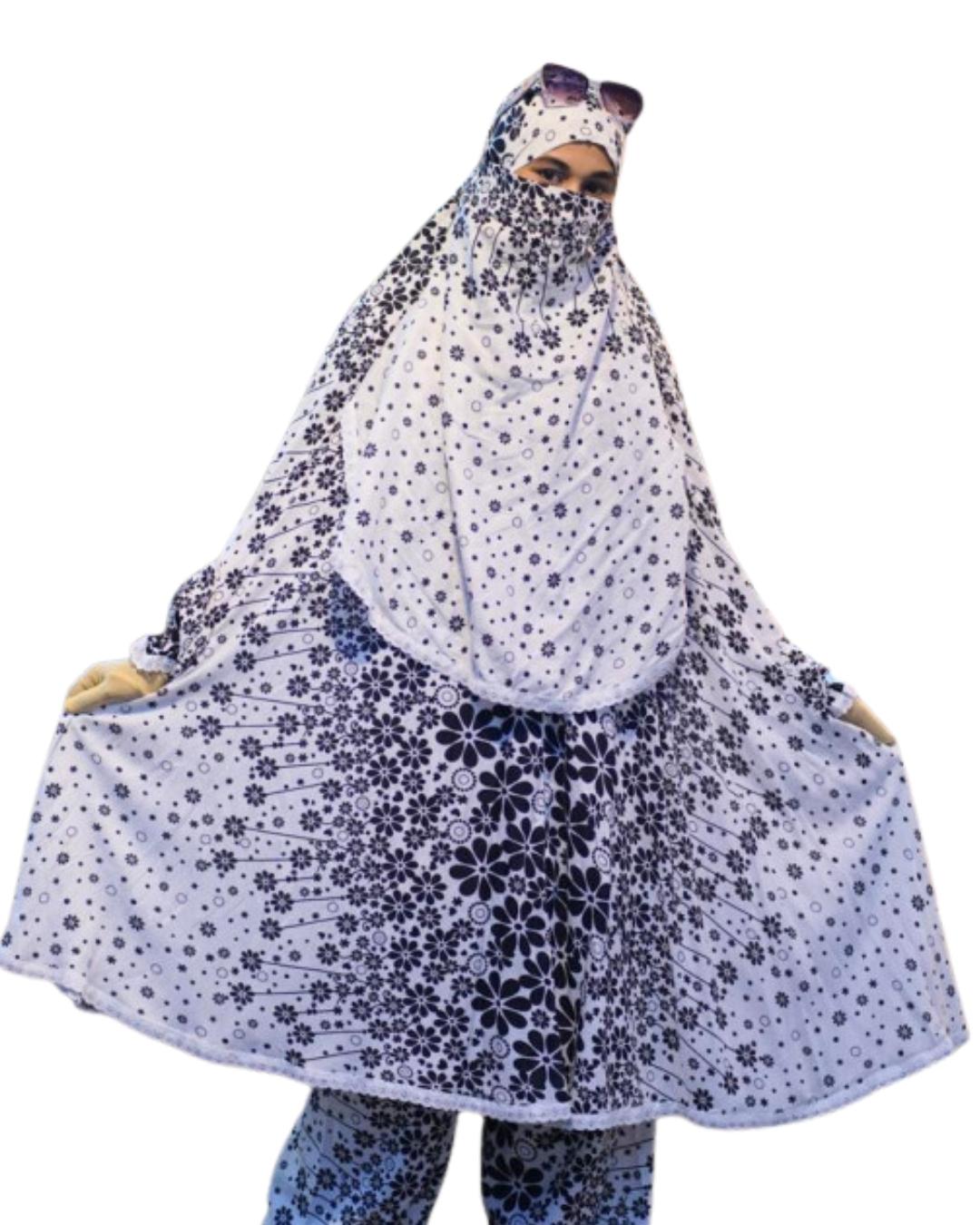 Plaju Khimar Set - Floral White, Ash & Blue Mixed Soft Linen