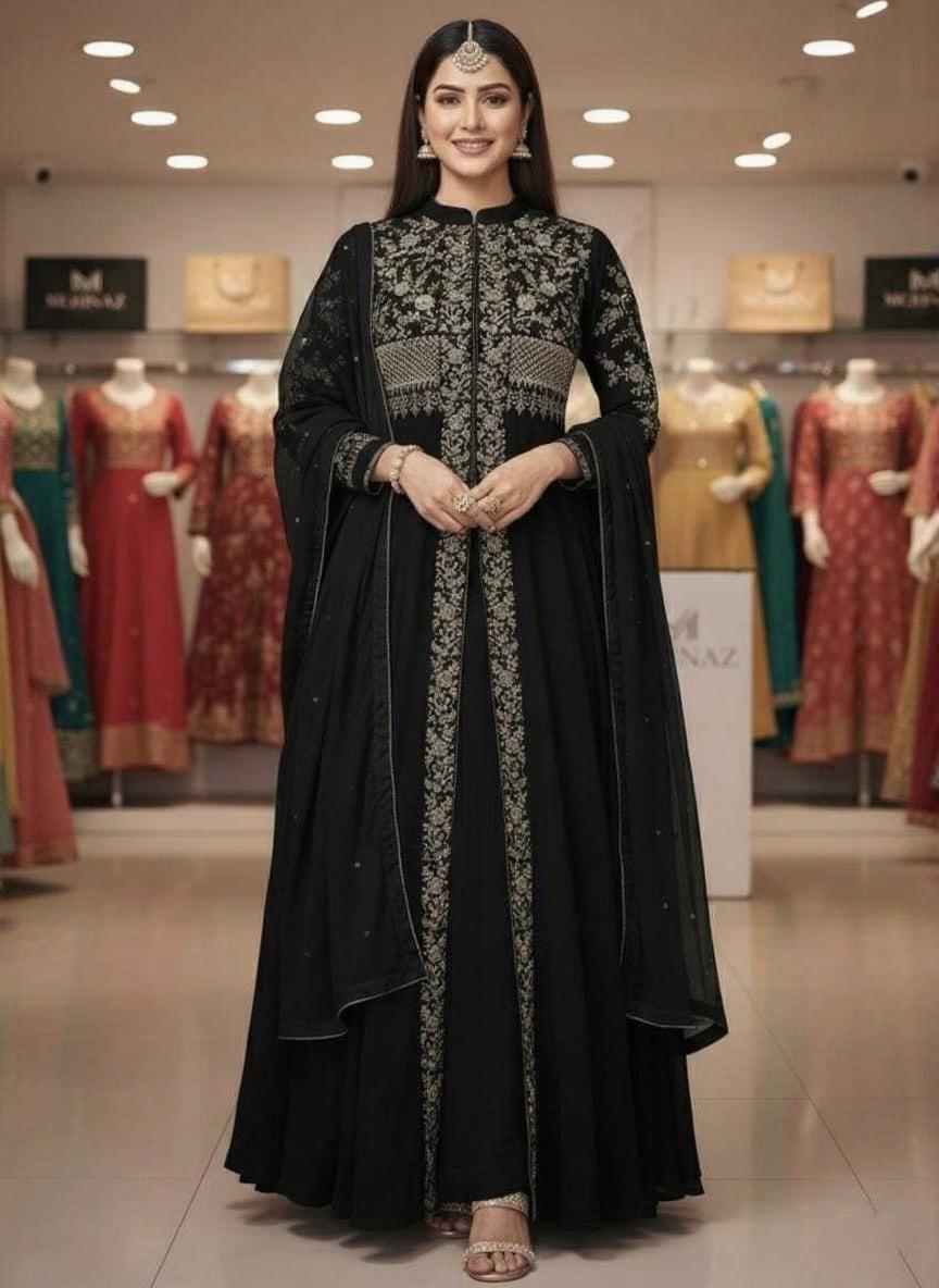 Make a graceful statement with this stunning ensemble adorned with intricate embroidery. The flowing silhouette and detailed craftsmanship create a perfect blend of tradition and modern elegance. Ideal for festive occasions, weddings, and special celebrations where you want to stand out effortlessly.