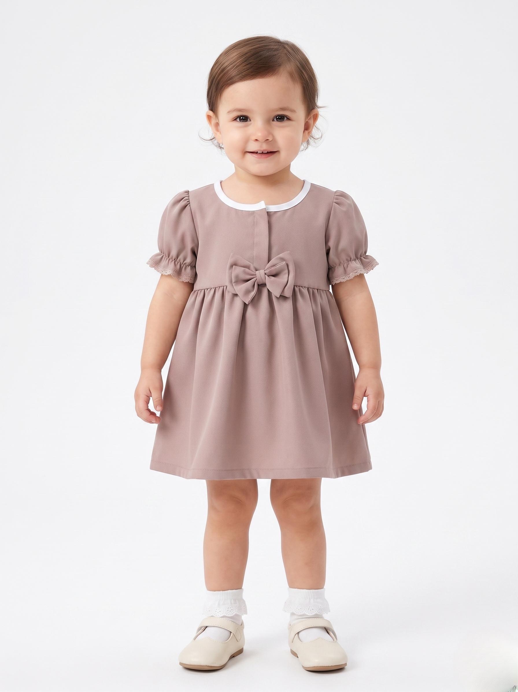 • Design: Cute front bow with button detailing and lace accents on neckline, sleeves, and hem