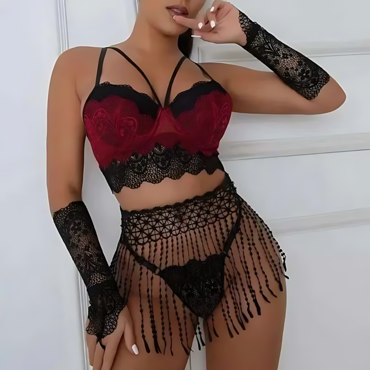 • Complete Fashion Set – Includes matching lingerie pieces for a coordinated look