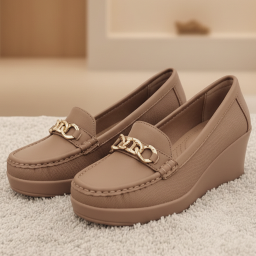 Chic & Sophisticated Design: Featuring a timeless wedge silhouette accented with tasteful metallic chain hardware, these loafers provide a polished, elevated look for any occasion.
